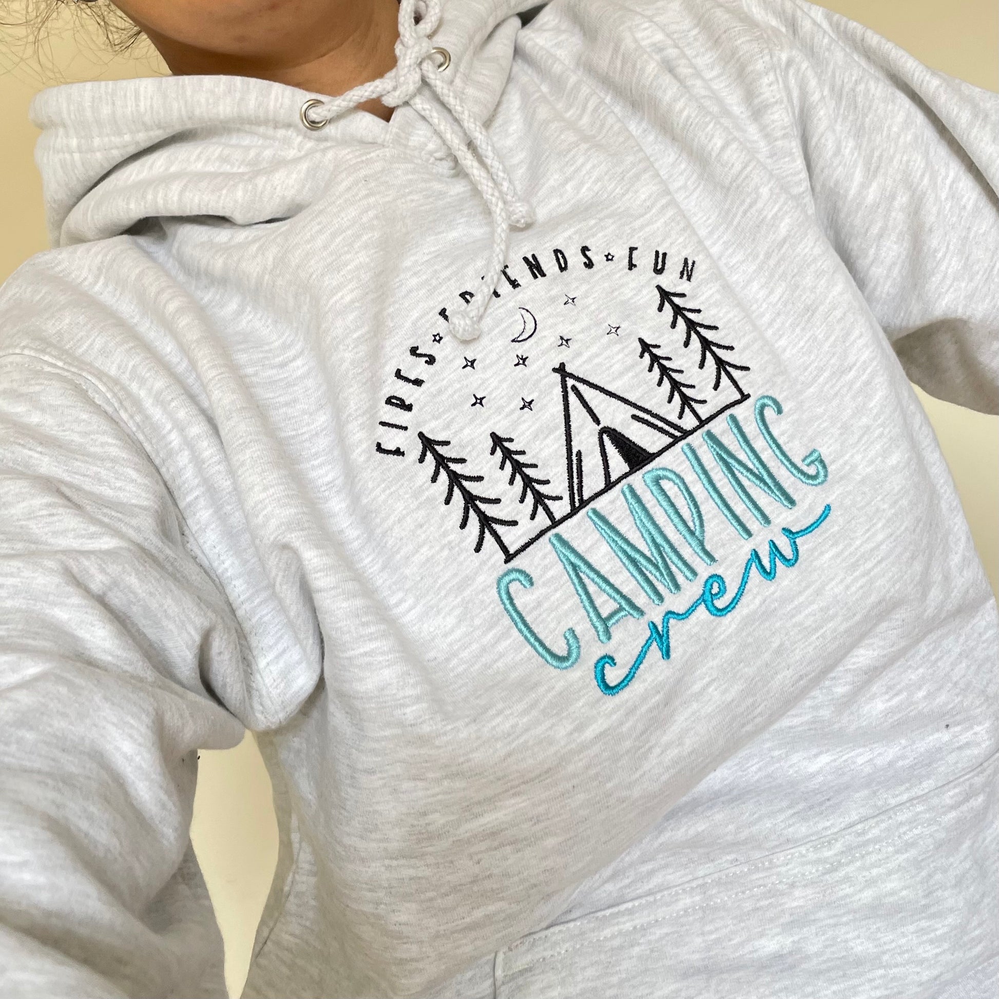 Celebrate outdoor adventures with the Camping Crew Embroidered Hoodie, designed for comfort and style. Featuring expertly embroidered stars, moon, and tent motifs, this crewneck captures the spirit of nights spent around the campfire with friends. Its soft, durable fabric ensures warmth and lasting wear, making it an essential layer for any camping trip or casual outing. Embrace the outdoors with a hoodie that combines craftsmanship with a love for nature.