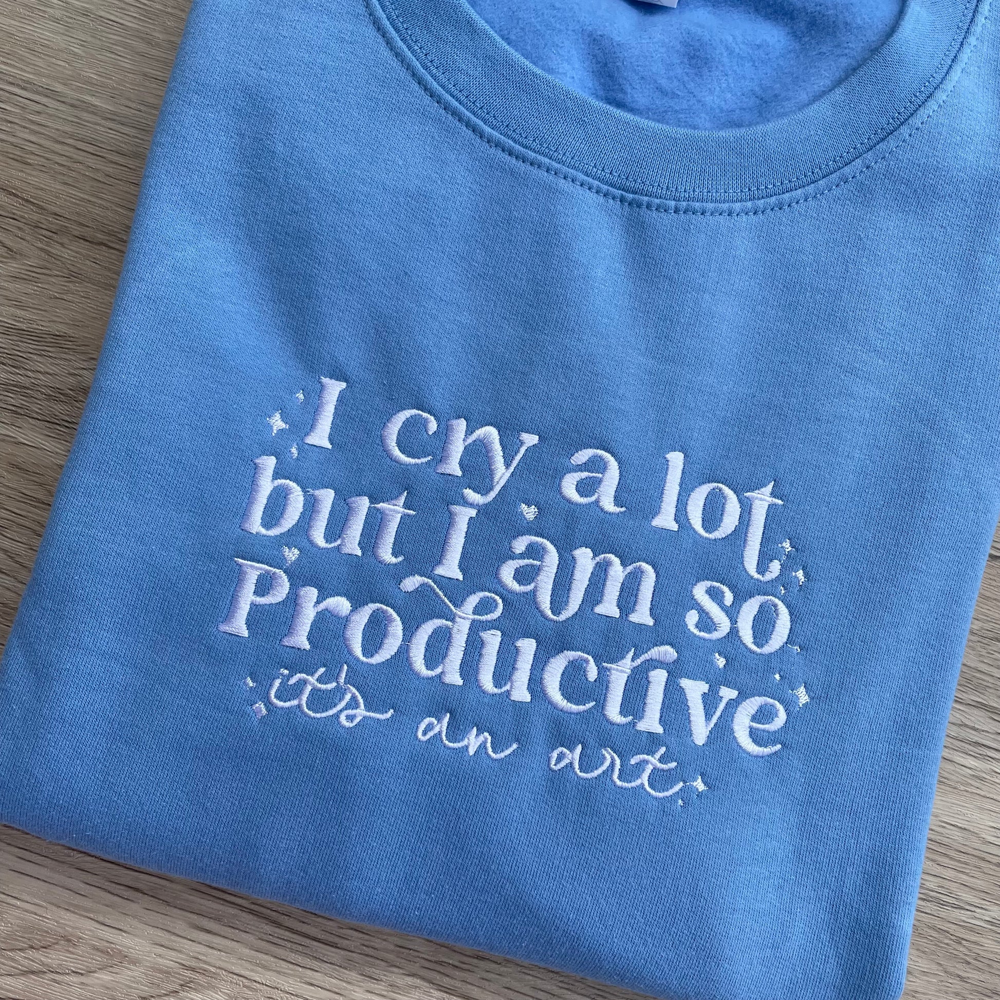 Embrace your unique blend of emotion and efficiency with the "I Cry a Lot But I am so Productive 'it's an art'" Embroidered Sweatshirt. Crafted for comfort and style, this sweatshirt features detailed embroidery that highlights your resilience and creativity. Perfect for those who balance sensitivity with high performance, it offers a cozy fit ideal for both work and relaxation. Show the world that productivity and emotional expression can coexist beautifully.