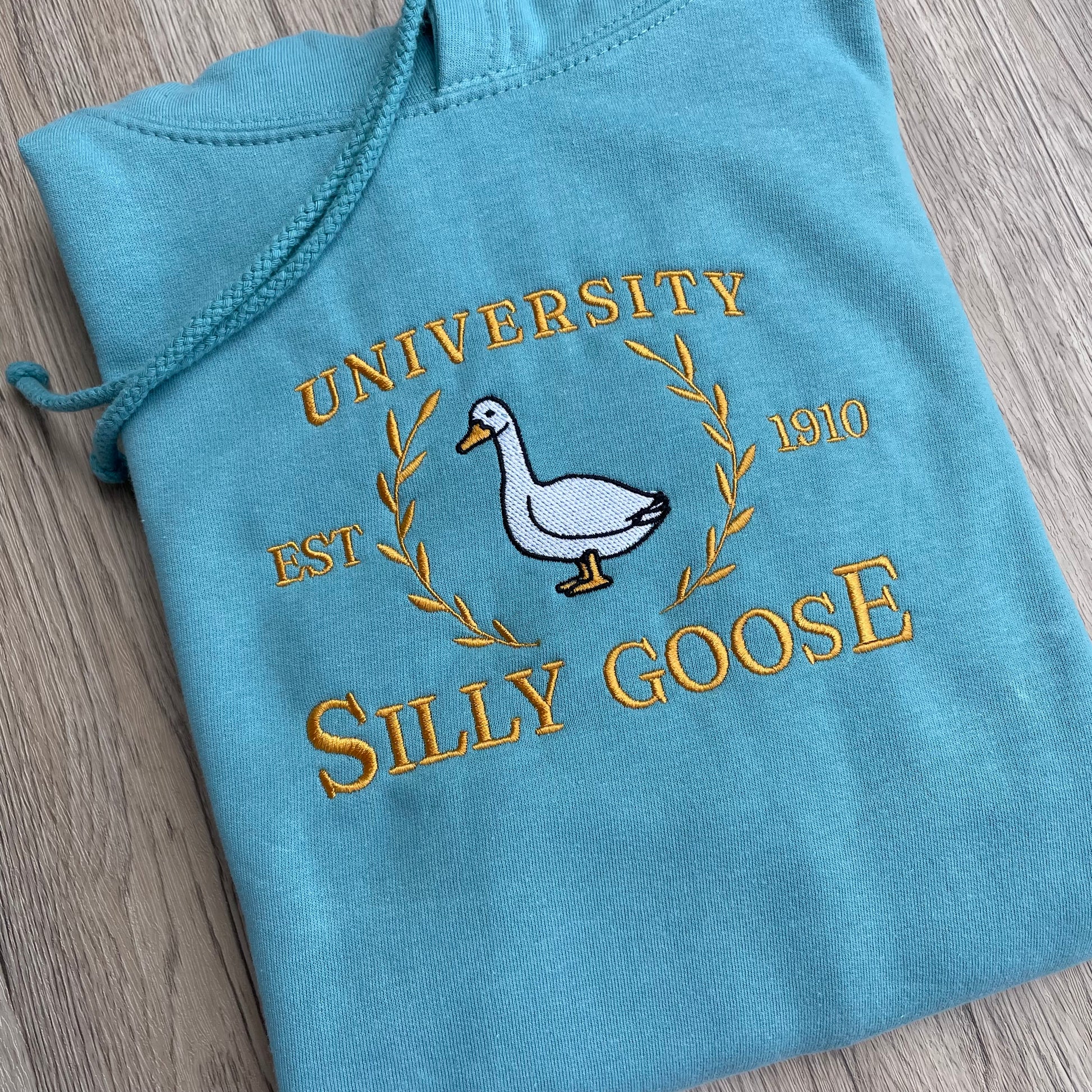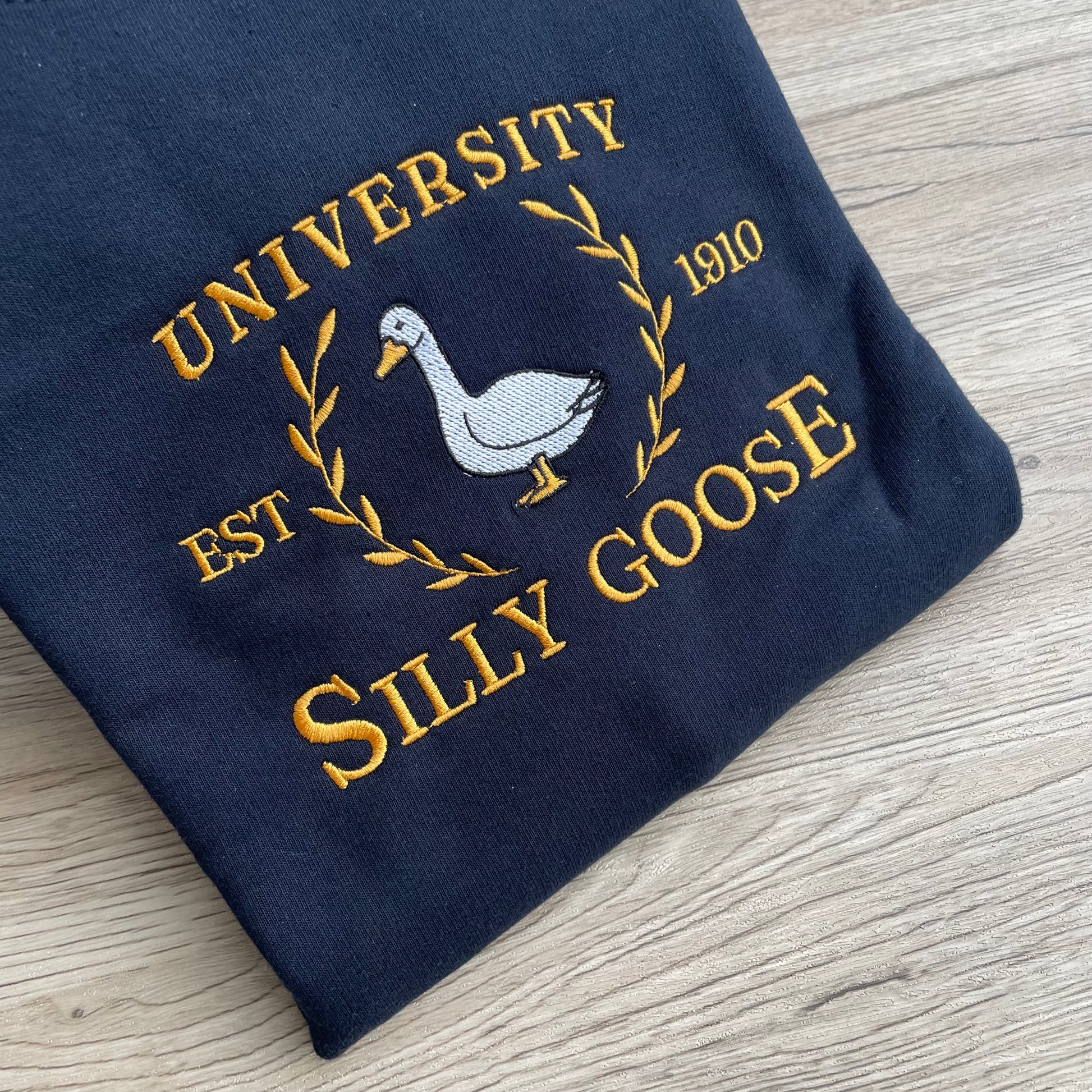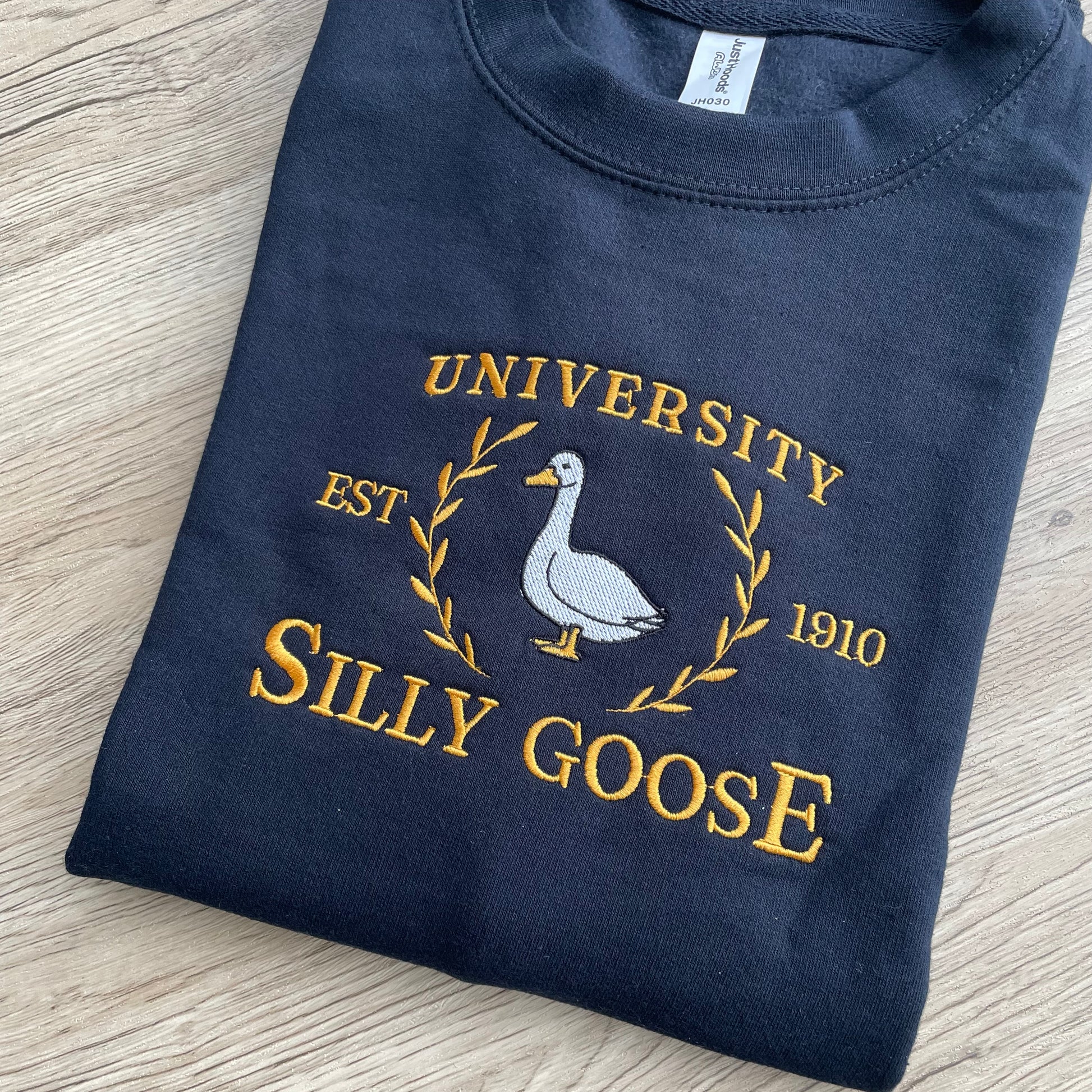 This University Silly Goose Embroidered Sweatshirt combines playful design with quality craftsmanship. Featuring detailed embroidery of a whimsical goose mascot, it offers a unique way to showcase school spirit. Made from soft, durable fabric, this sweatshirt ensures comfort and longevity, making it ideal for everyday wear or casual campus events. Its expert stitching highlights the intricate artwork, reflecting both style and attention to detail. Perfect for those who appreciate distinctive collegiate apparel with a touch of humor.